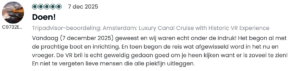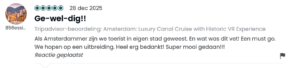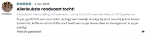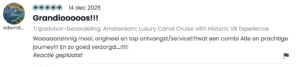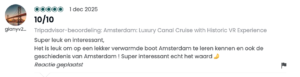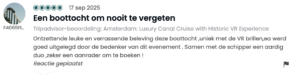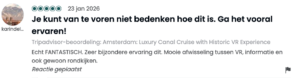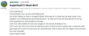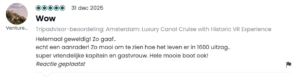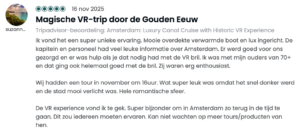 Sinds onze lancering in juni ’25 hebben bijna 6.000 bezoekers de tour beleefd — en hun reacties zijn overweldigend. Met een 4,9 gemiddeld op Tripadvisor (300 recensies) en een gemiddelde van 5,0 op Google (210 recensies) heeft VR Voyage zich al binnen zes maanden naar de top van de Amsterdamse vaarwereld gevaren. Maar nog mooier dan die cijfers zijn de woorden en beschrijvingen van onze gasten. In deze blog delen we een kleine greep uit wat er tijdens de tour te zien is evenals de vele enthousiaste reacties die we hebben mogen ontvangen.